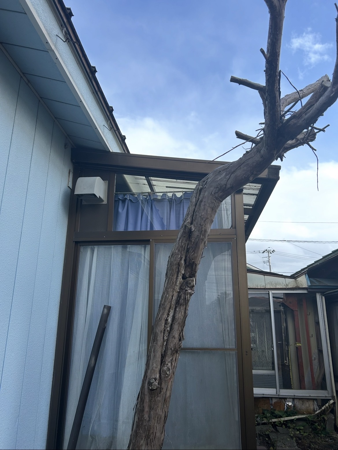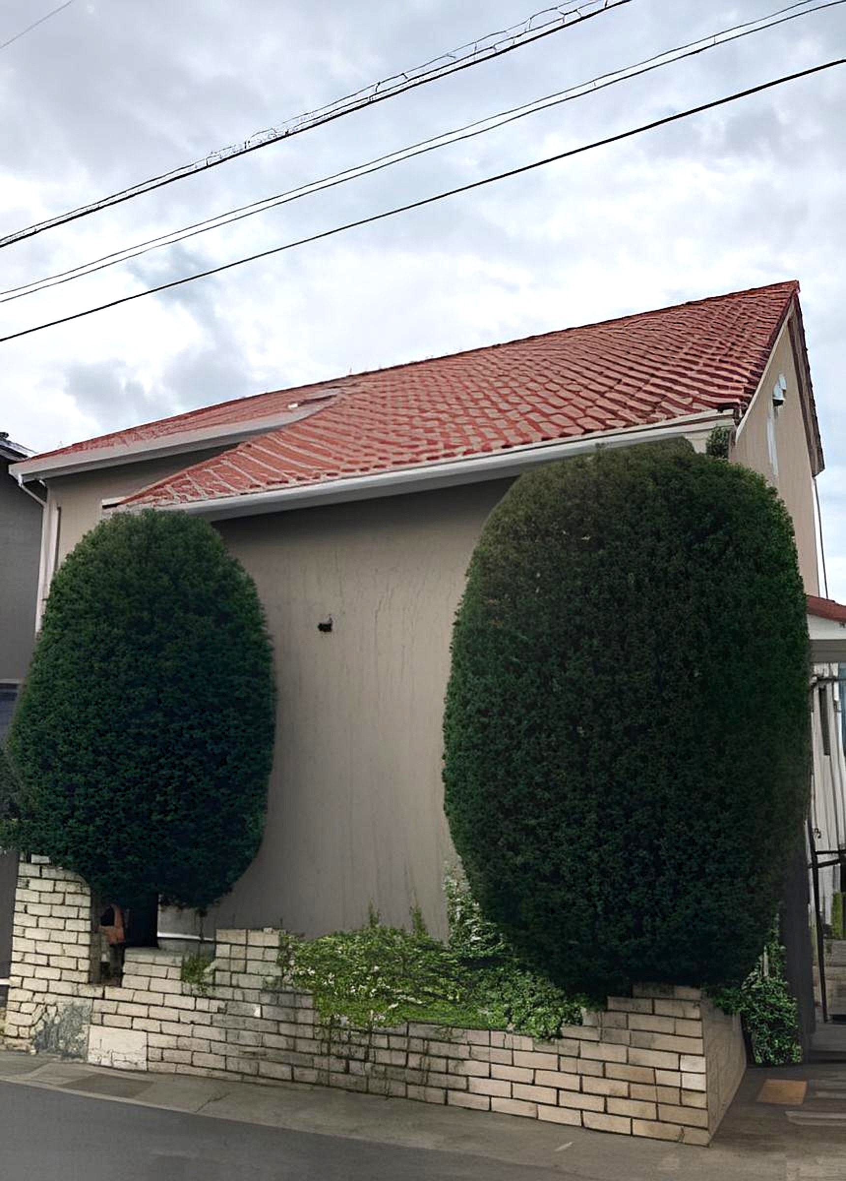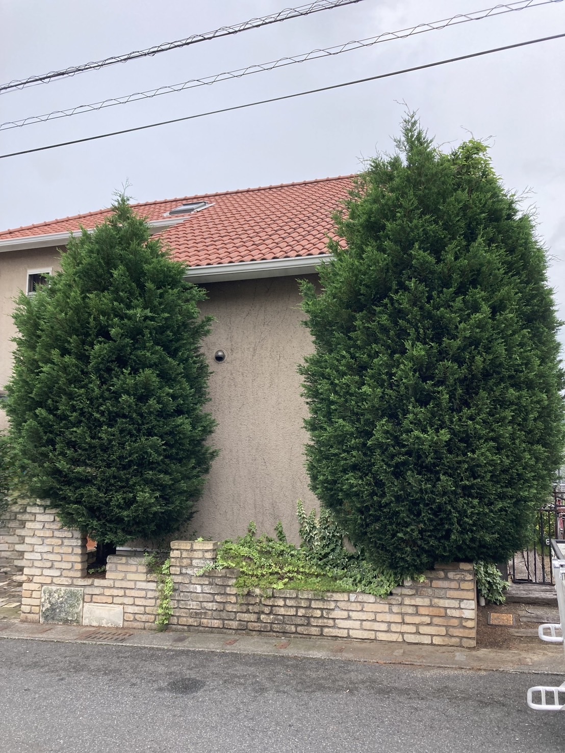 今回お伺いした現場では、素敵な洋風のご自宅と外構フェンスの間に、2本のコニファーが植えられていました。当初はコンパクトなサイズだったそうですが、現在は窓を遮るほどの高さとなり、枝葉も密集してしまっている状態でした。